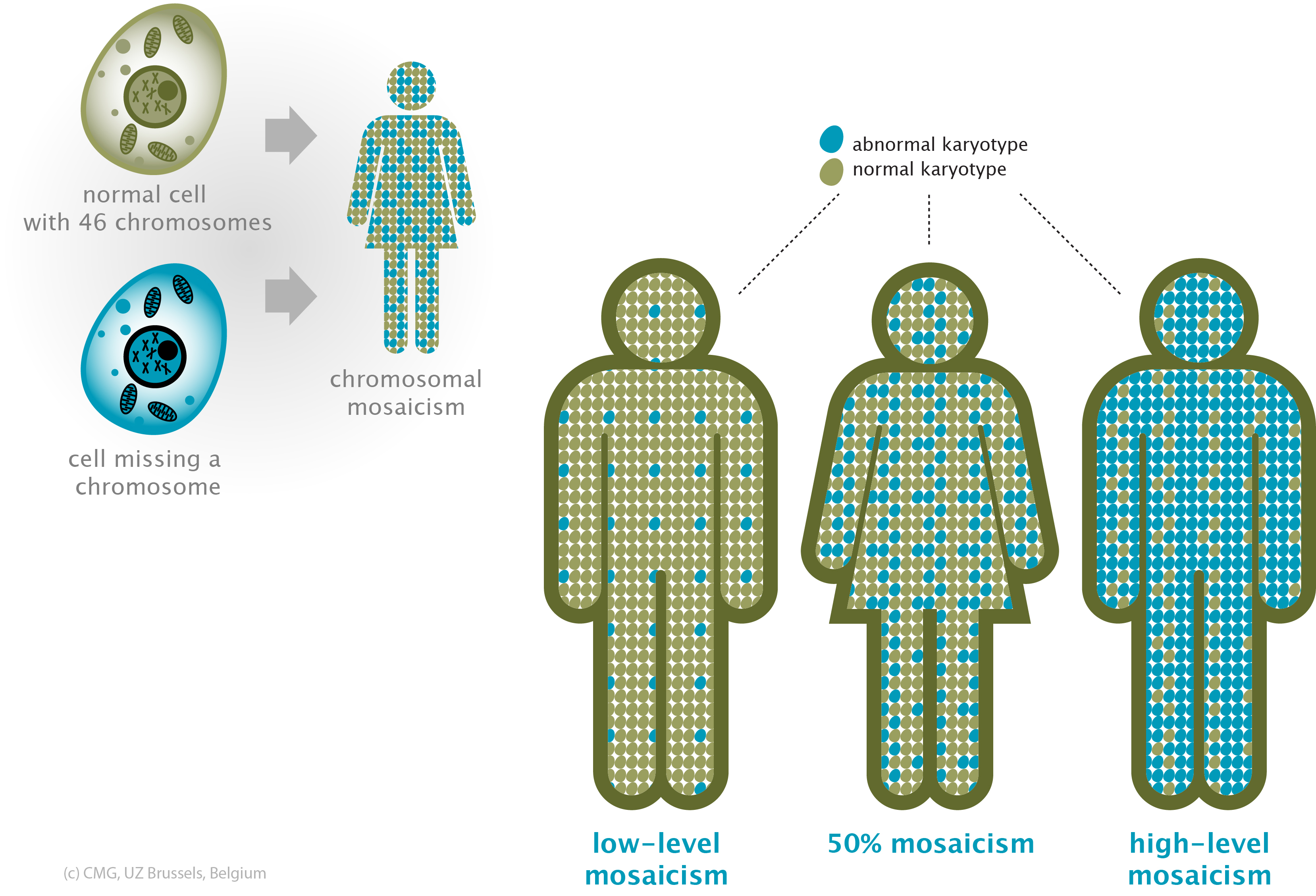 A person with a genetic disorder may have both normal and abnormal cells. We call this phenomenon mosaicism and it is the result of an error in cell division affecting a number of cells during early development of an embryo or fetus.