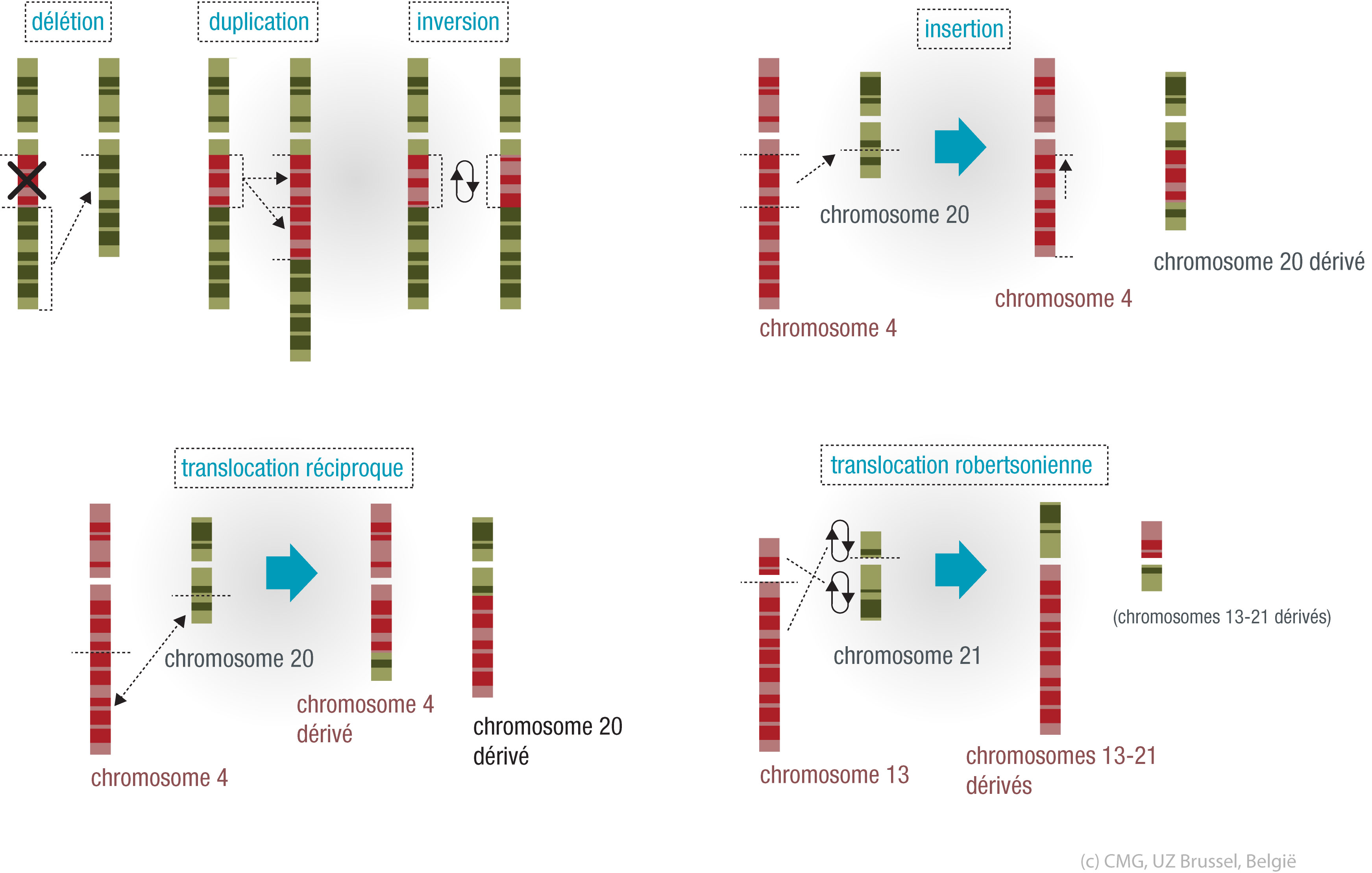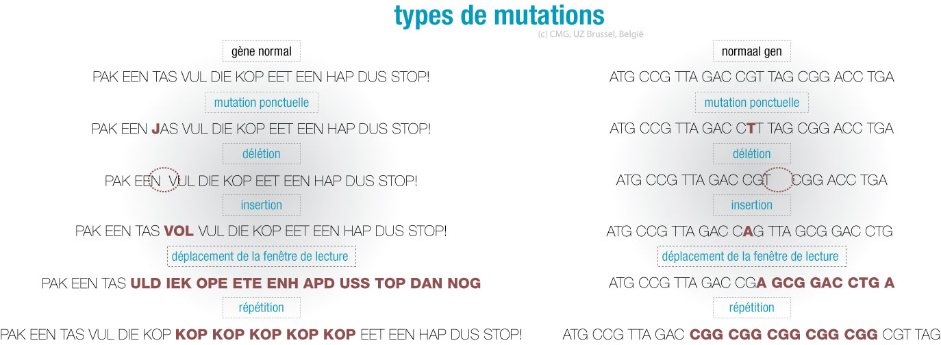 Une ‘erreur’ génétique peut se produire d’une part au niveau chromosomique. Elle est alors visible au microscope comme une anomalie numérique (duplication ou délétion d’un chromosome complet) ou structurelle (translocation, inversion, insertion partielle ou délétion ou duplication). D’autre part, des erreurs peuvent aussi se produire au niveau de l’ADN, à l’intérieur d’un seul gène (par ex. une mutation ponctuelle).