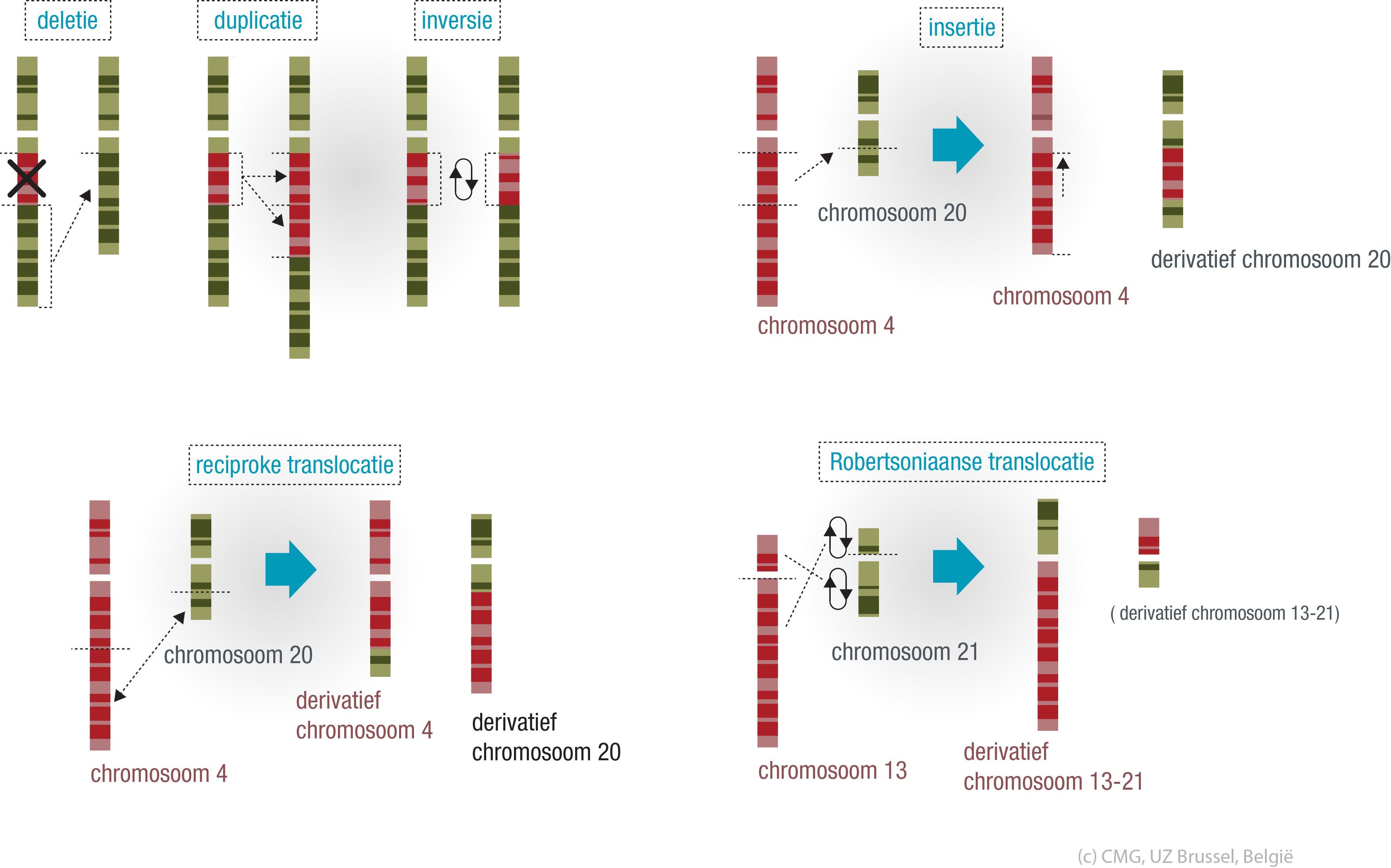 Een genetische 'fout' kan zich enerzijds voordoen op chromosomaal niveau. Dan is ze zichtbaar onder de microscoop als een numerieke afwijking (duplicatie of deletie van een volledig chromosoom) of als een structurele (translocatie, inversie, partiële insertie of deletie of duplicatie). Anderzijds kunnen zich fouten voordoen op DNA-niveau, binnen één gen (bv. een puntmutatie).