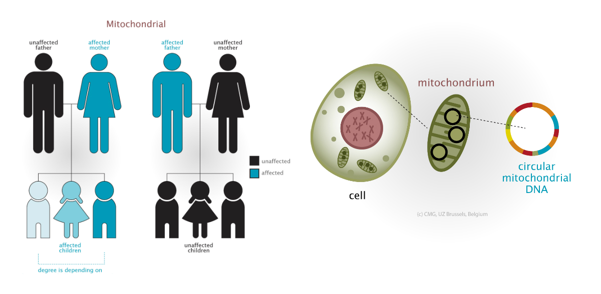 In addition to chromosomal inheritance of nuclear DNA there is also mitochondrial inheritance, where specific characteristics are inherited exclusively from the mother (see mitochondrial DNA). This does not mean that a descendant is automatically affected by a mitochondrial DNA disorder: that will depend on the quantity of mitochondrial DNA that carries the disorder.